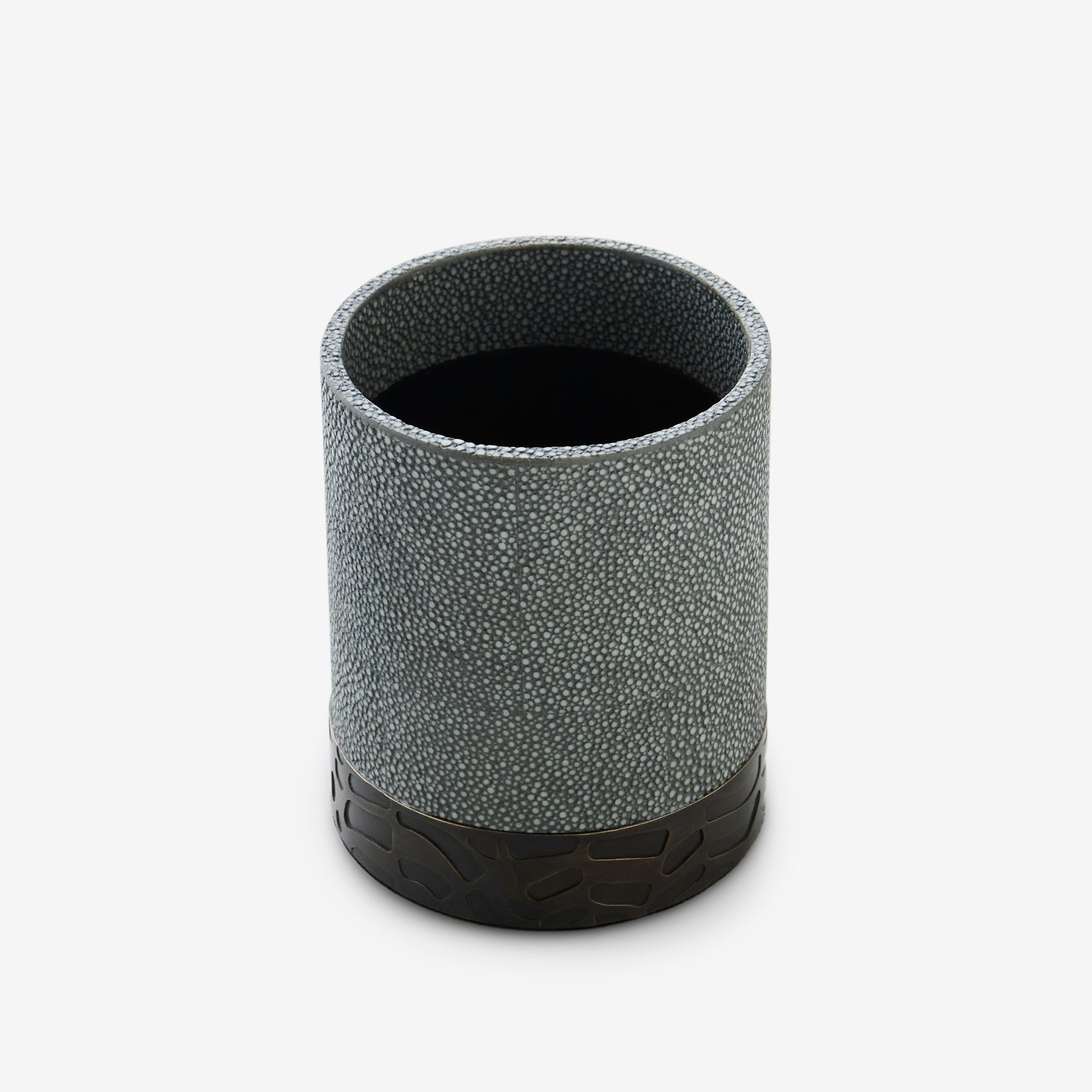 Providing both interior detail and functionality for any home, our pot can be used for desk items or on your dressing table with make-up brushes. Made with faux shagreen, lined with beautiful suede and finished with our gorgeous bespoke herringbone detail.